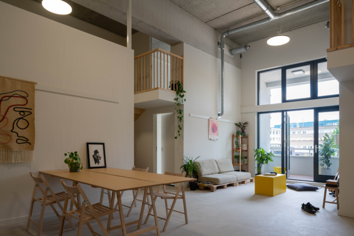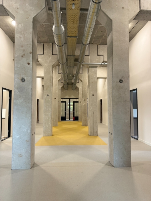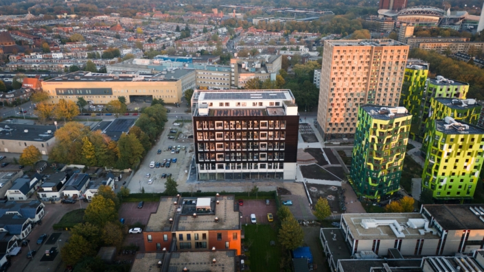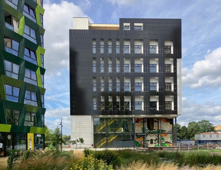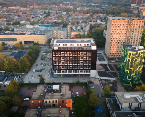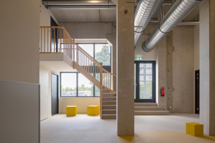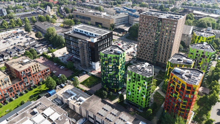 Herindeling van de begane grond activeert de vier, nu transparante, zijden van het gebouw. Karakteristieke elementen als betonnen kolommen, hoge plafonds en de diepte van het gebouw zijn behouden en optimaal benut. Op de verdiepingen zijn, inspelend op de verschillende woonbehoeften en levensstijlen van de student, zowel zelfstandige studio’s (126) als onzelfstandige kamers (80) met gedeelde voorzieningen (co-living) gerealiseerd. Elkaar ontmoeten wordt gestimuleerd door gezamenlijke voorzieningen zoals studieruimtes en wasserettes op een aantal lagen van het gebouw en een terras op het dak met uitzicht over de stad.