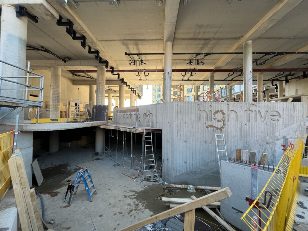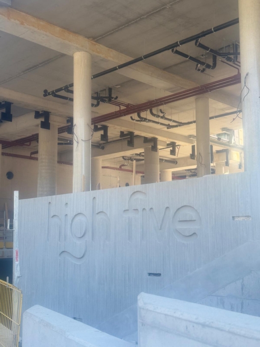 De begane grond van het gebouw – een 6 meter hoge en transparante plint – heeft een oppervlakte van ruim 1.800 m². Daarvan is ca. 350 m² bestemd voor horeca (met aangrenzend terras) en ca. 650 m² voor sportvoorzieningen, voor iedereen toegankelijk. In de resterende 800 m² komen voorzieningen voor bewoners van High Five die ontmoeting, samen leven en ‘community building’ stimuleren en faciliteren: een woonkamer-/lounge, vergader- en studie-/stilteruimte. Ook de beheerdersruimte, wasserette, postvakken en pakketwand bevinden zich daar. En je stapt zo de binnentuin in. Voor het gebied rondom het gebouw is een integraal landschapsontwerp gemaakt, compleet met binnentuin, horeca- en bewonersterras en enkele nieuwe wandelverbindingen richting de Johanna en de naastgelegen Zandlaan. Daarmee ligt een wandeling richting de omliggende landgoederen van Amelisweerd/Rhijnauwen binnen handbereik.